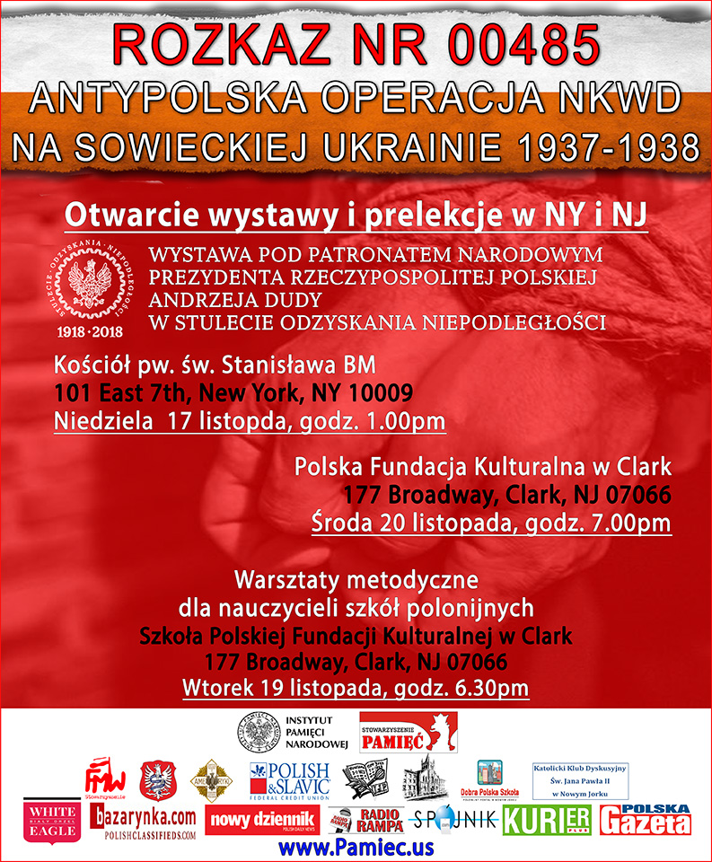 W niedzielę 17 listopada 2019 r. w kościele pw. św. Stanisława Biskupa i Męczennika na Manhattanie w obecności wicekonsula RP w Nowym Jorku Mateusza Gmury miała miejsce inauguracja wystawy Archiwum Instytutu Pamięci Narodowej pt. „Rozkaz nr 00485. Antypolska operacja NKWD na sowieckiej Ukrainie 1937 – 1938”. Wystawie towarzyszyła prelekcja o operacji antypolskiej NKWD, którą wygłosili: zastępca dyrektora Archiwum IPN dr Mariusz Żuławnik oraz kustosz wystawy Paweł Zielony.